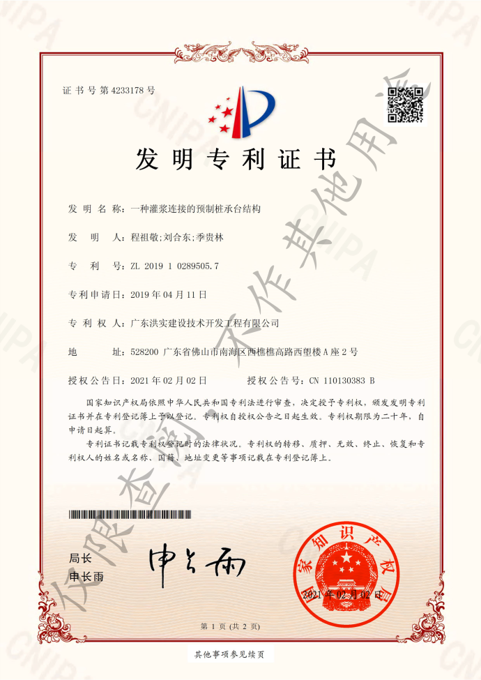 一种灌浆连接的预制桩承台结构-发明专利证书
