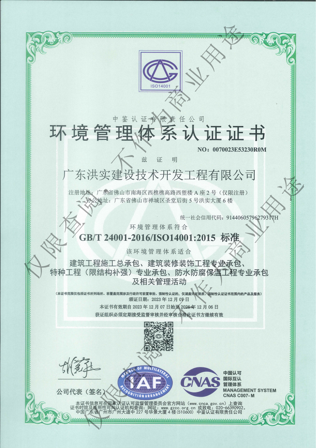 环境管理体系认证证书