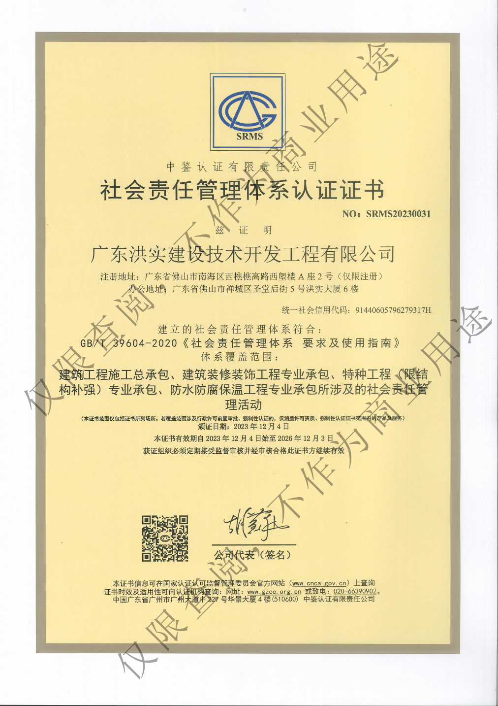社会责任管理体系认证证书
