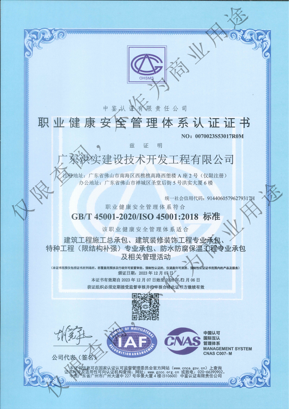 职业健康安全管理体系认证证书